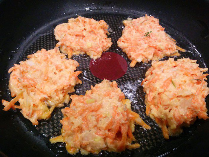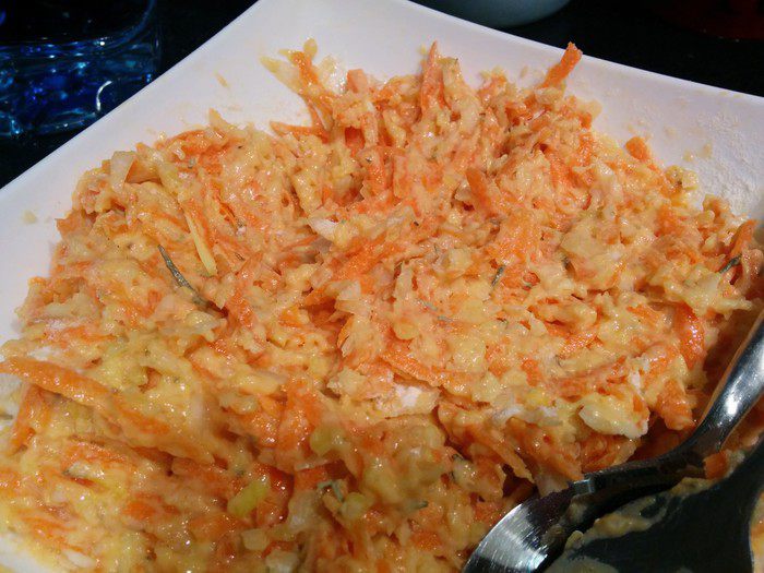 Натираем морковь на крупной терке, лук-порей мелко режем или измельчаем в блендере. Добавляем яйцо, соль, перец и муку. Перемешиваем до однородной массы.
