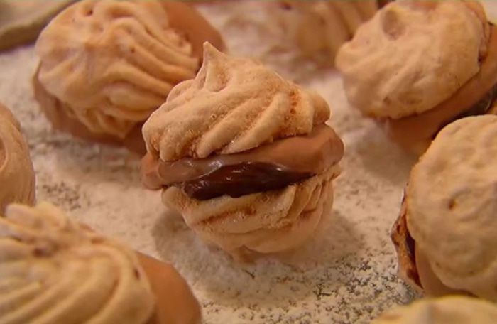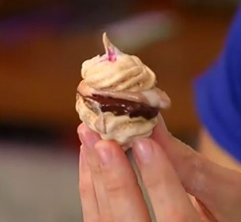 Половину меренг намазать оставшимся шоколадом со сливками, а затем кремом из взбитых сливок. Сверху накрыть остальными меренгами.
