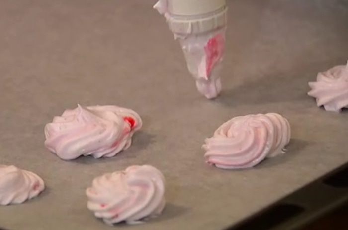Противень выстелить бумагой для выпечки, отсадить меренги небольшого размера и выпекать в разогретой духовке 1 час.