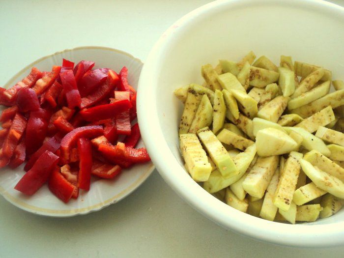 Баклажан почистить от кожицы и порезать брусочками по 4 см в длину, посолить и оставить на 15 минут, что бы выделился горький сок. Перцы очистить и нарезать полосками в длину как и баклажан.