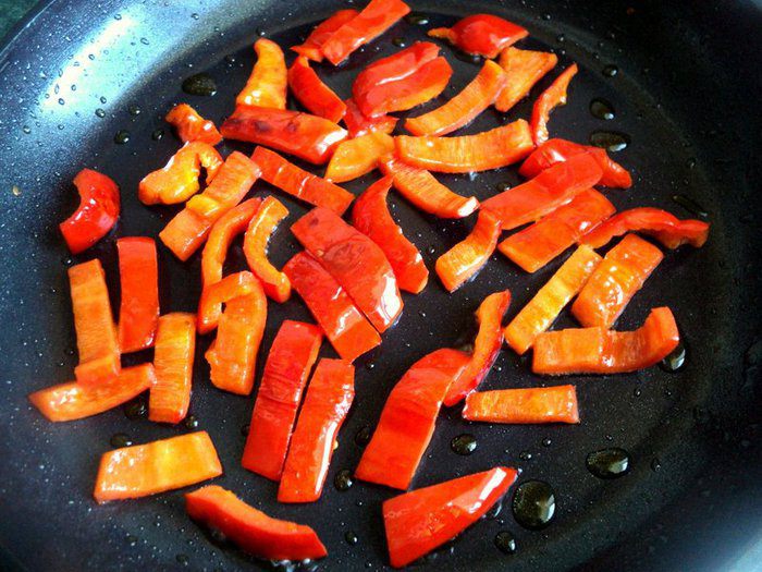 В сковороде, следом за баклажаном обжарить перцы, отложить.
