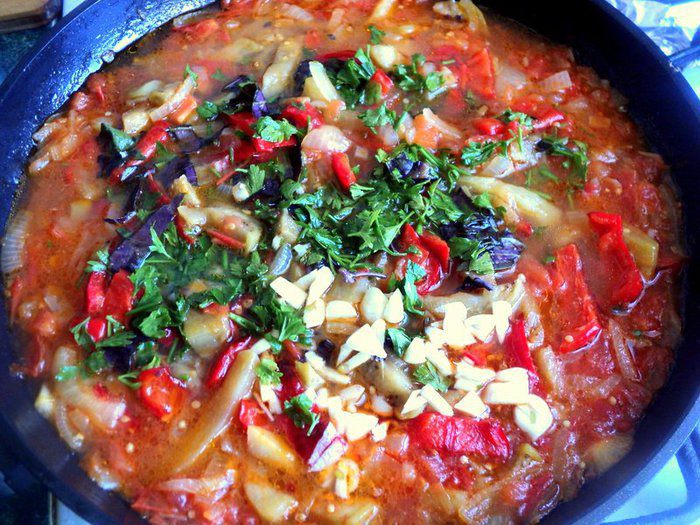 Затем добавить перец и баклажаны, потушить 5 мин, добавить томатный сок, продолжать тушить ещё 5 минут, посолить, добавить специи, сахар, зелень, чеснок, через минуту снять.