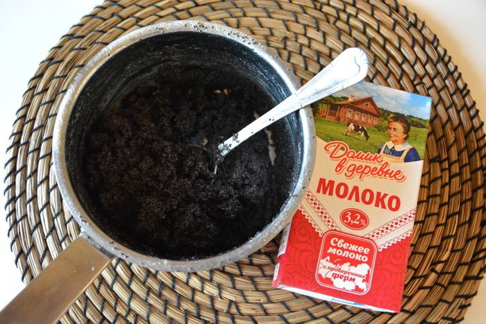 Добавить к маку молоко «Домик в деревне», сливочное масло, сахар, перемешать. Поставить на огонь и выпарить жидкость. Следите, чтобы молоко не убежало во время варки. Пока вы будете жарить блины, начинка будет готова.