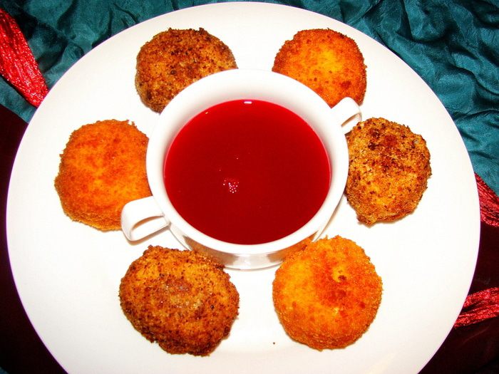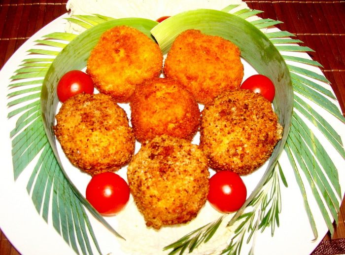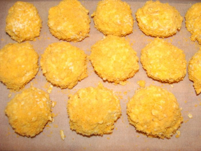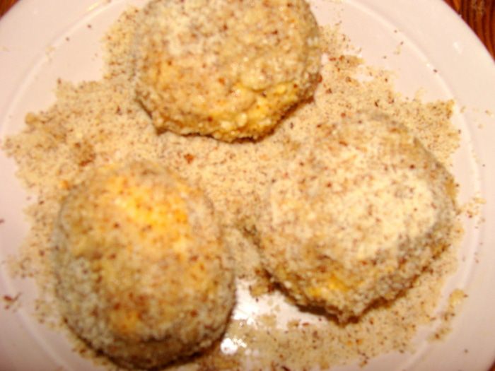 Достать подмерзшие сырные шарики из морозилки. В сковороде или фритюре разогреть масло. Если делать не шарики, а котлетки по форме, можно и просто пожарить на сковородке. Обжаривать 1-1.5 минуты с каждой стороны (если во фритюре). Можно вместо ореха использовать второй раз сухари панировочные. Я делала и так и так, поэтому цвет у шариков разный.. С орехом конечно пикантнее вкус.