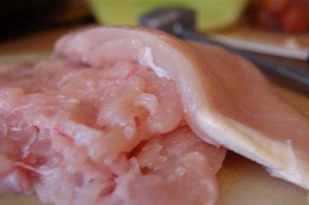 Куриную грудку порезать пополам, чтобы образовался кармашек. Слегка отбить посолить.
