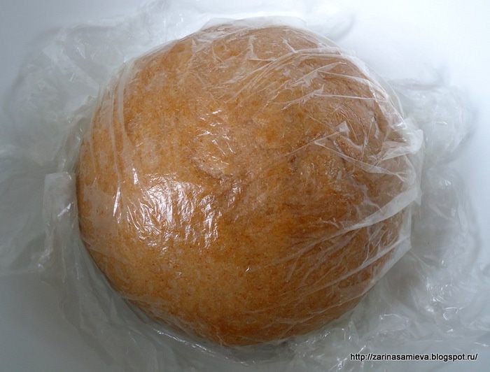 Тесто уложить в чашу и прикрыть пленкой. Оставить в теплом месте на 1,5 часа.