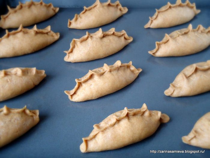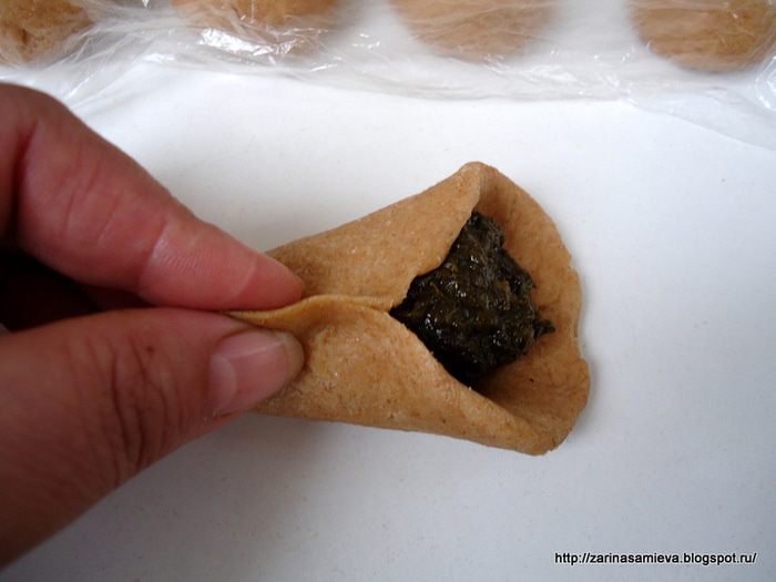 Из каждого кусочка теста сделать лепешки, которые начинить щавелевой начинкой. Защипнуть края теста.