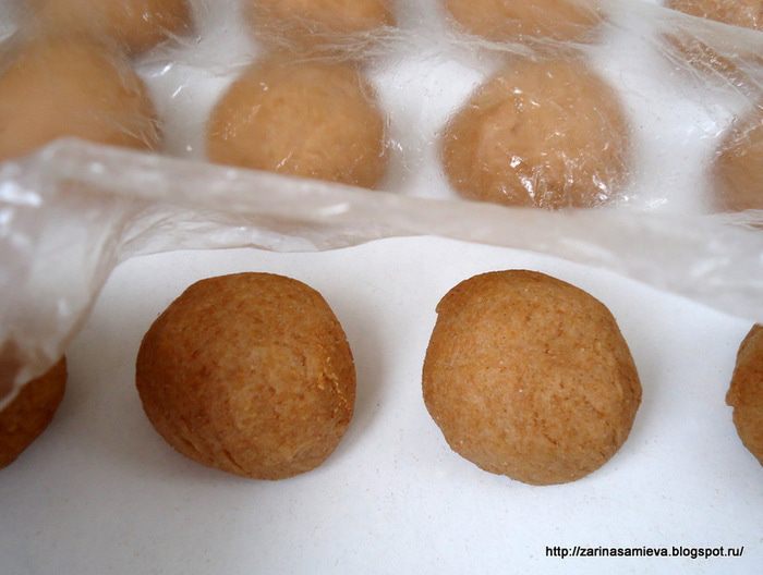 Готовое к работе тесто разделить на кусочки, сформовав их в шарики. У меня получилось 18 штук.