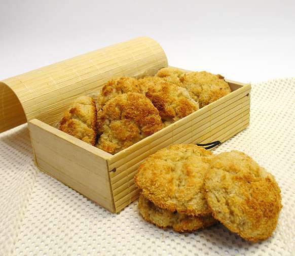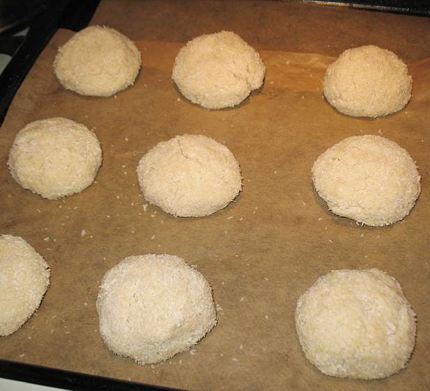 Столовой ложкой набирать массу и сформировать шарик. Шарик панировать в кокосовой стружке. Выкладываем на противень, можно слегка прижать.