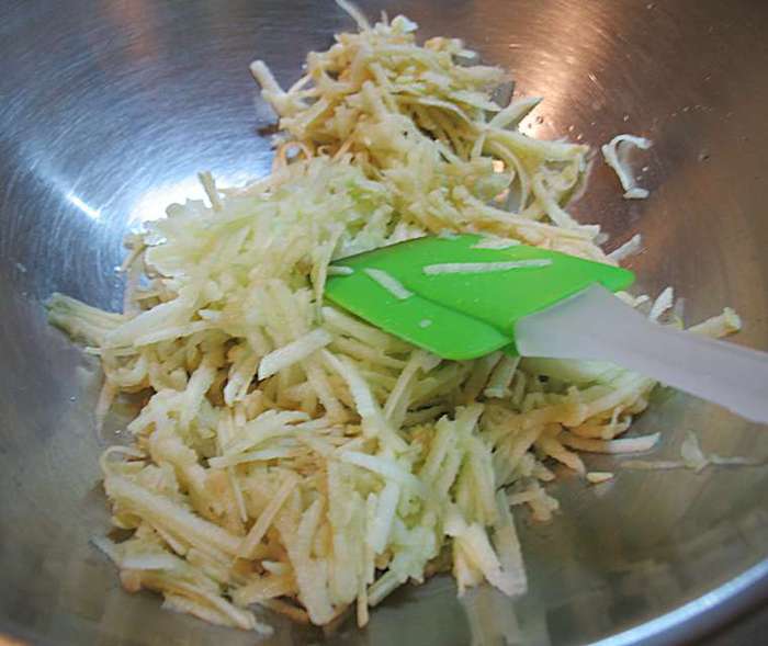 Яблоки очистить, удалить середину и натереть на крупной терке. Яблок по весу я взяла 330 г.