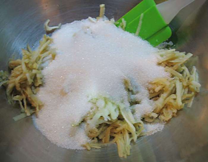 К натертым яблокам добавить сахар и соль. Перемешать. Если любите более сладкую выпечку то увеличьте его количество на 50 г.