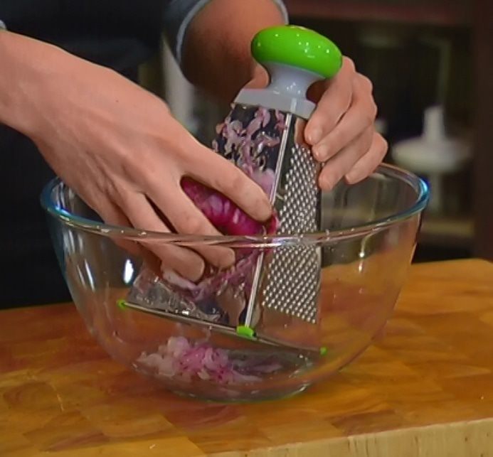 Красный лук почистить и натереть на крупной терке.