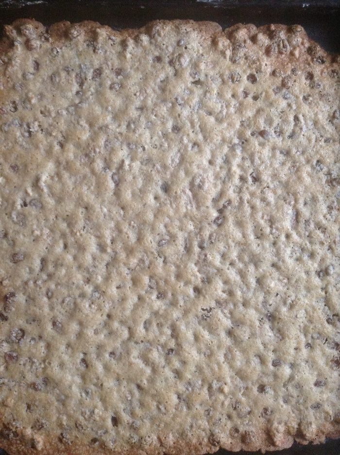 Смазать маслом противень и очень тонко распределить по нему полученную смесь и выпекать при 200 градусах около 15-20 минут до легкого зарумянивания.