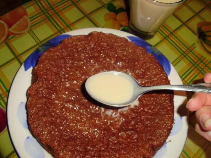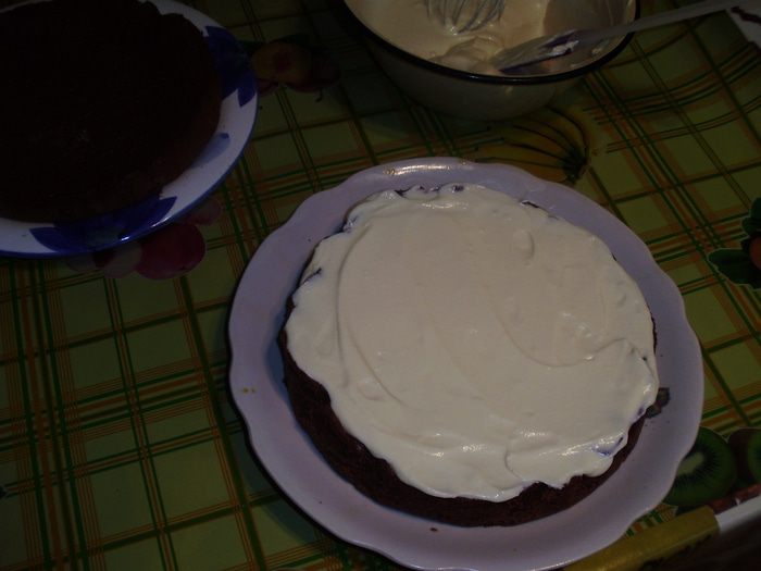 На готовый корж нанести обильно крем.