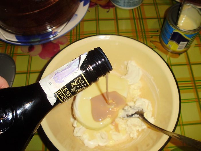 Предварительно достать из холодильника маскарпоне и филадельфию. Аккуратно смешать сыры и добавить сгущёнку по вкусу + ликёр.