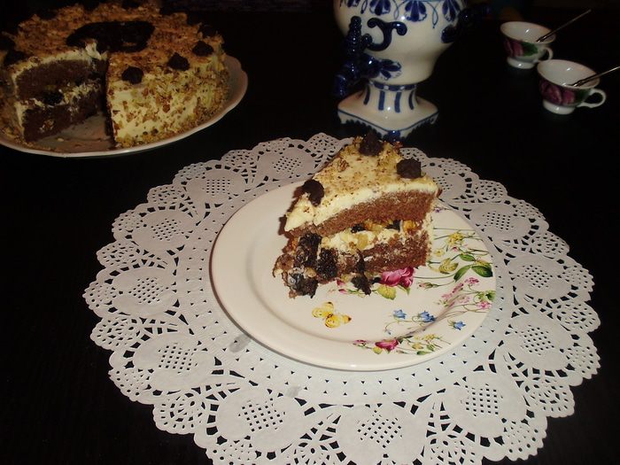 Обмазать кремом, присыпать орехами и украсить.Поставить в холод на ночь для пропитки. P.S. По украшению я не ас, поэтому не судите строго...
