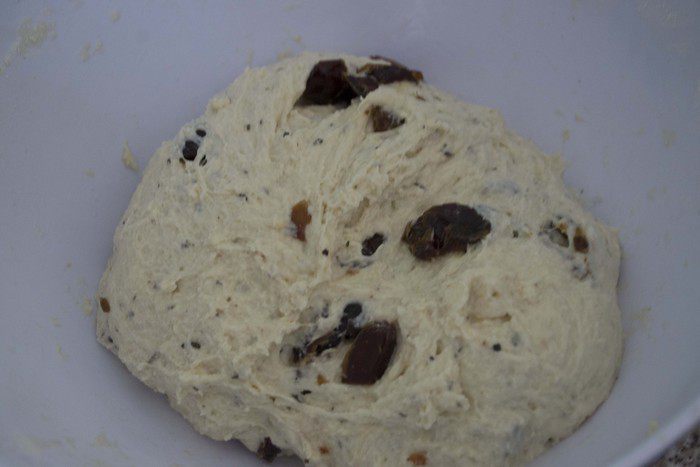В миску просеять муку, добавить манку, дрожжи, соль, сахар,травы сухие и понемногу вливать воду. Замесить мягкое липкое тесто, добавить нарезанные финики, оставить несколько крупных кусочков для украшения, (предварительно избавить от косточек) и масло. Месить до полного соединения теста, фиников и масла. Затянуть миску пленкой и оставить в тепле на 1 час.