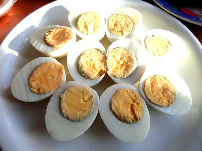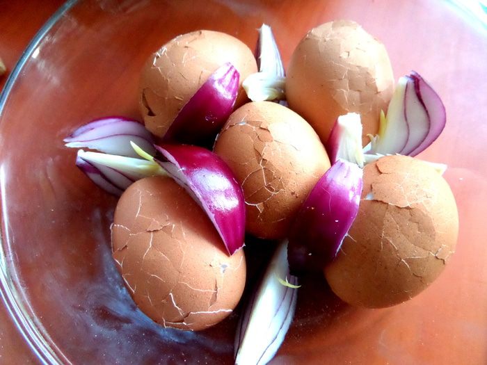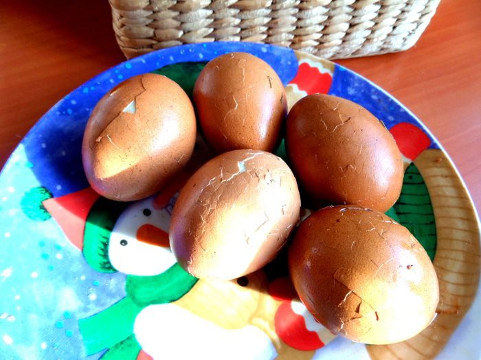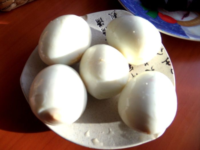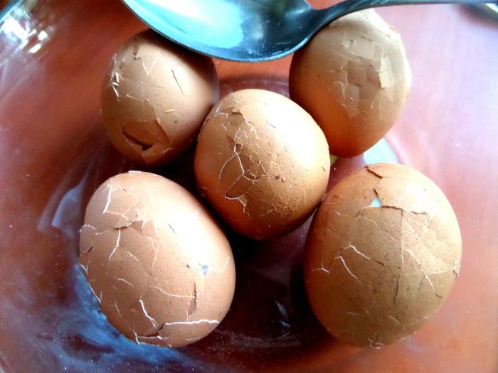 Теперь самое забавное в рецепте! Остывшие в холодной воде яйца нужно хорошенько побить ложкой,чтобы были трещинки по всей поверхности)))