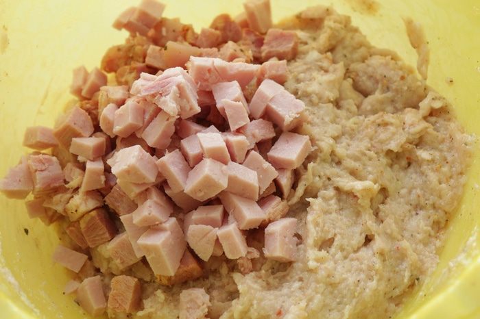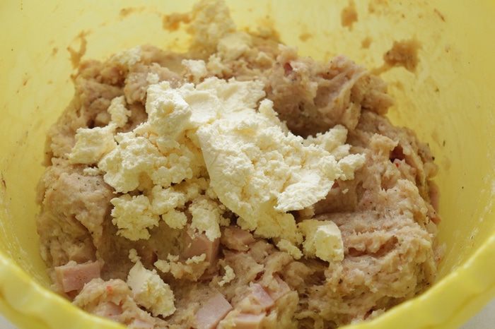 Нарезанную кубиками ветчину добавить в фарш. Хорошенечко все перемешиваем.