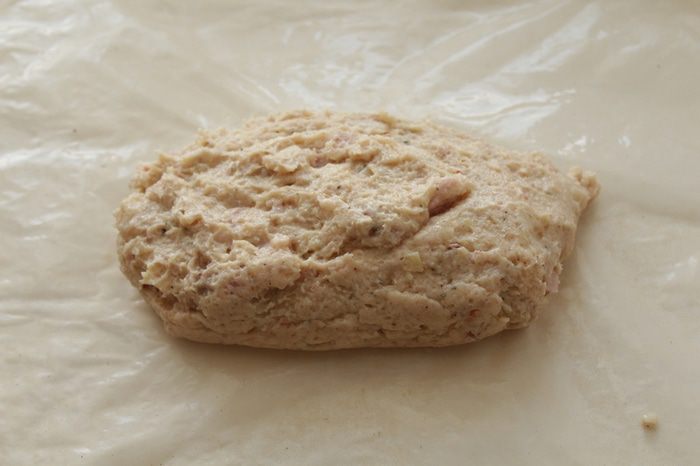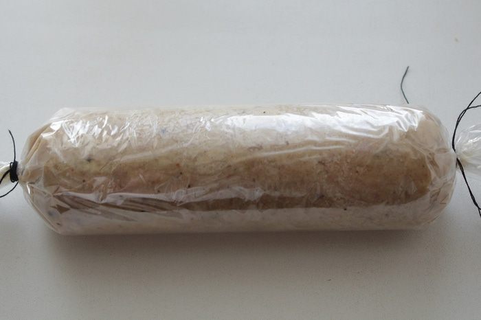 Свернуть батон в форме конфеты. Концы перевязать ниткой. Таких колбасок выходит две.