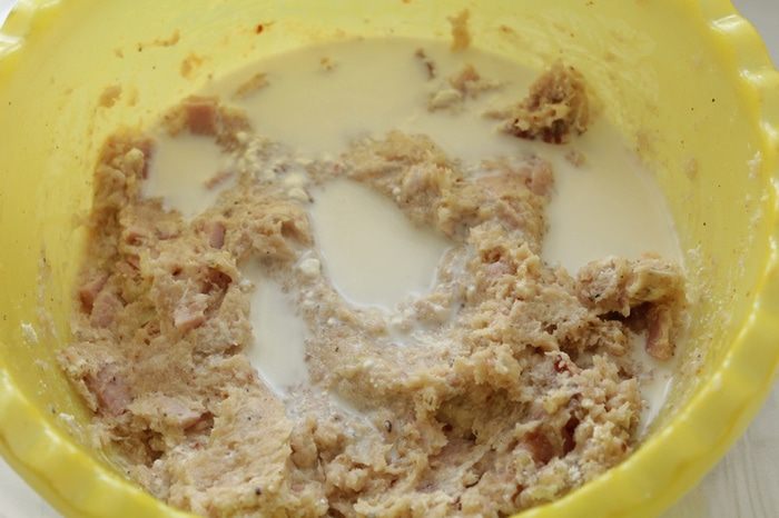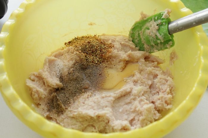 Грудку, половину ветчины, лук,чеснок измельчаем в блендере. Солим, перчим, добавляем специи, 1 яйцо.