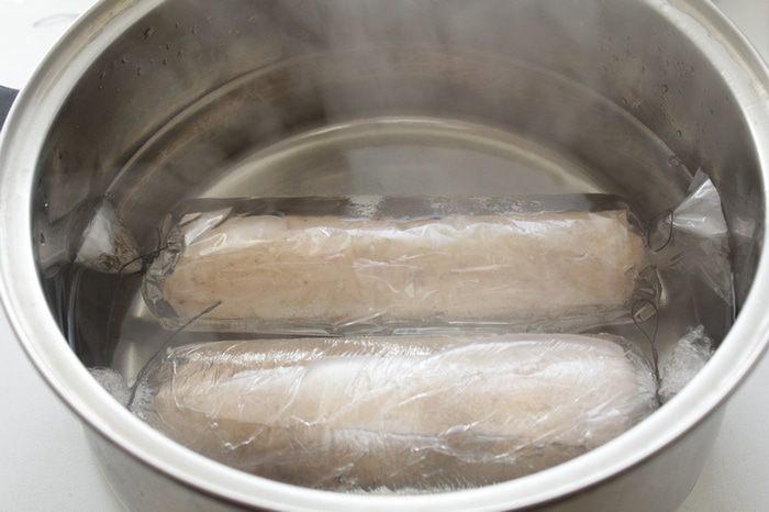 Заливаем галантин водой и ставим на плиту варить на среднем огне 40-45 минут.