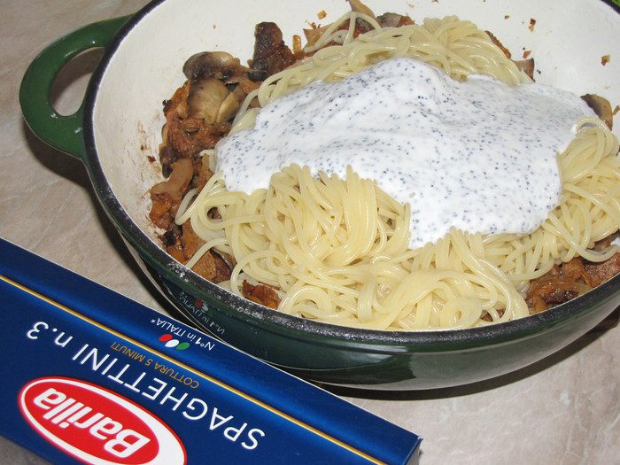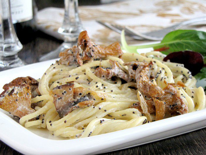Параллельно поставить на огонь кастрюлю с водой. Пока вода закипает, добавить в сковороду сливочное масло и нарезанные грибы любые (у меня шампиньоны и лисички). Если грибы замороженные, то предварительно разморозить и отжать воду. Обжаривать грибы пока они не станут мягкими, примерно 5 минут.