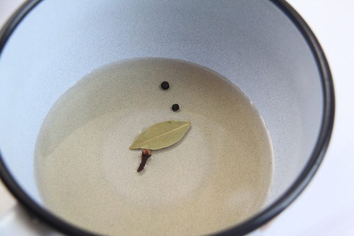 Уксус довести до кипения с бутоном гвоздики, горошинами перца и маленьким лавровым листиком.