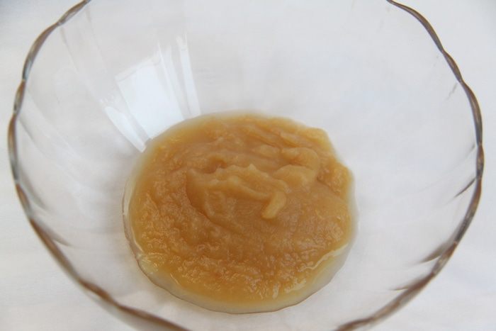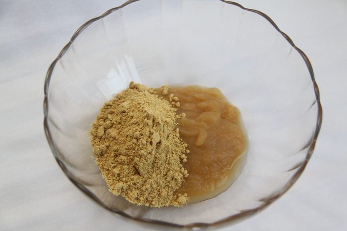 Соединить 4 столовые ложки яблочного пюре и 3 столовые ложки горчичного порошка.