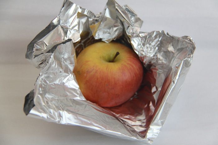 Яблоко обернуть в фольгу и запечь в духовке до готовности (или в микроволновке, без фольги).