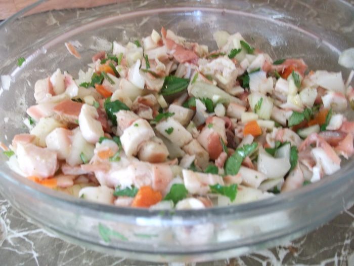 Нарезаем маринованные овощи (у нас называются пикли) ещё один недостаток, нет маринованых овощей пришлось остановиться на огурцах.. хотя если нет в наличие именно сборных овощей, можно брать любые имеющиеся в наличии.в том числе и огурцы, далее добавляем мелко нарезанный чеснок, лук, кинзу, соль, перец, уксус (по вкусу, нравиться поострее можете добавить ещё) и оливковое масло (по вкусу, если нравиться можете полить обильно). Перемешиваем..салат готов!