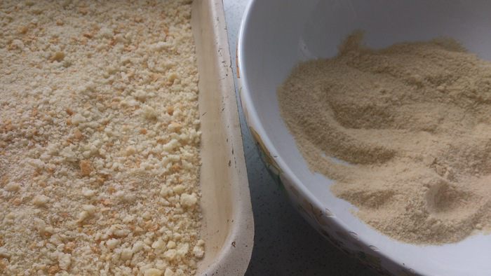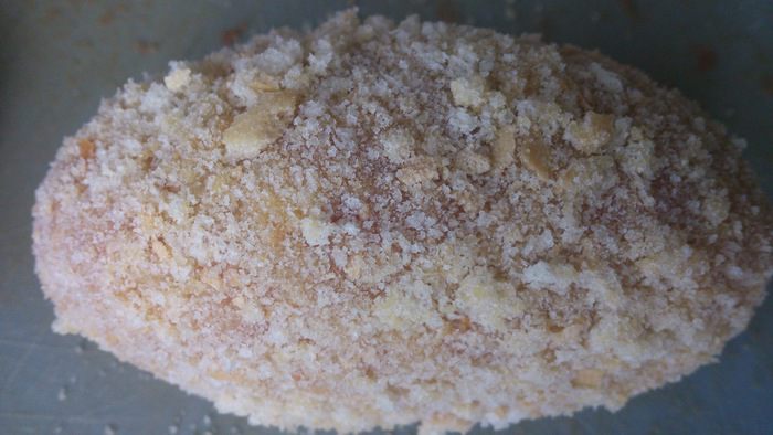 2.Сухари для верхнего слоя нужно сделать собственноручно и размолоть их в крупную крошку. На это количество фарша пойдет 1 батон. Для первой панировки подут обычные мелкие панировочные сухари.