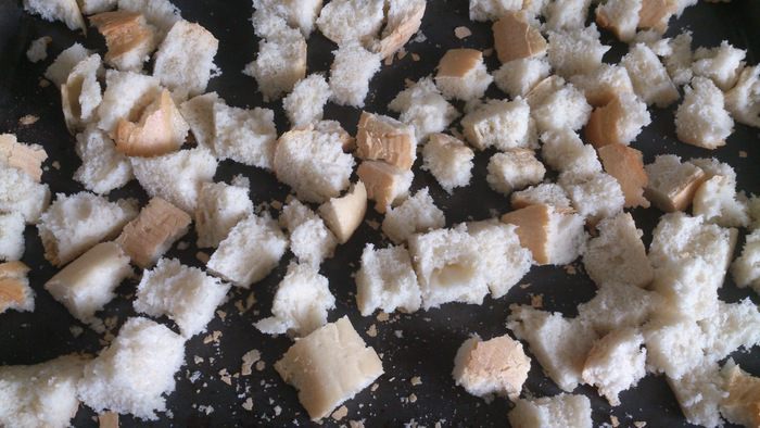 Батон подсушить в духовке и измельчить в крупную крошку.