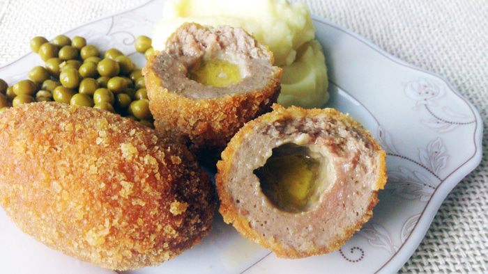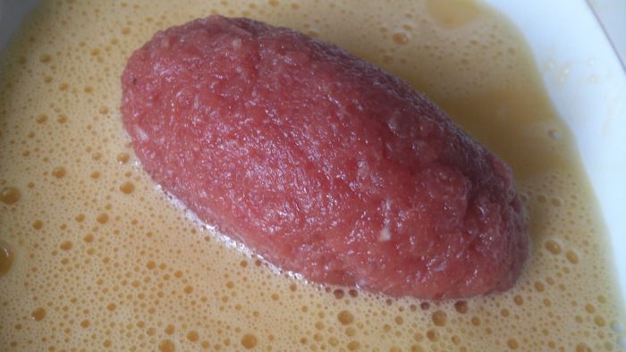 Слепить котлетку в форме дирижабля, тщательно залепить шов. Обмакнуть котлету в яйцо.