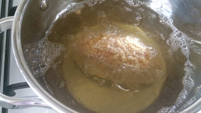 Разгреть подсолнечное масло. Масло должно доходить минимум до половины котлеты. Теперь важный момент. Во время жарки нужно постоянно поворачивать котлету, чтобы масло от сильного жара не впиталось в фарш. Жарим 7-8 минут.