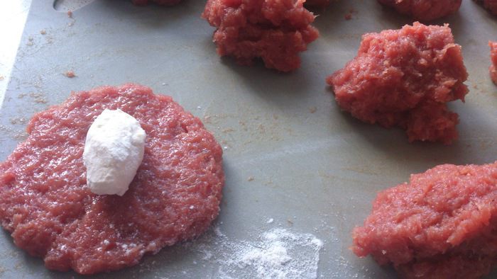 Разделить фарш на 11 частей. На одну котлету получается около 100 г фарша. Размять в лепешку и смазать немного яйцом. Кусочек масла обвалять в муке и положить в середину.