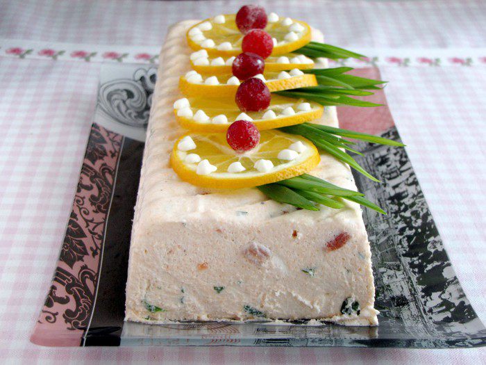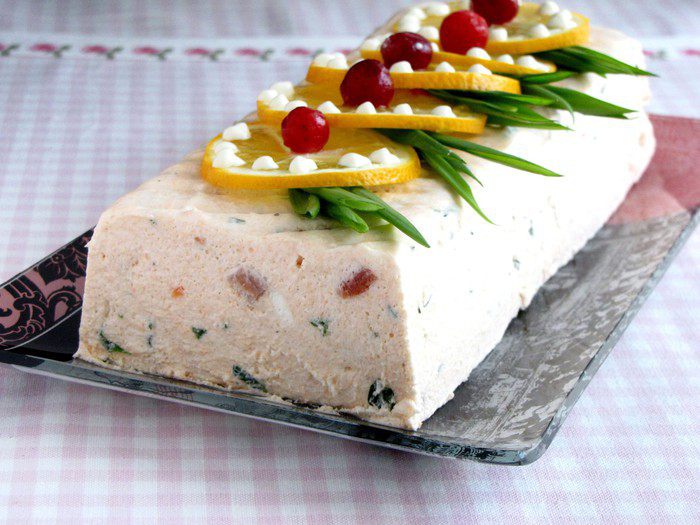 Аккуратно обвести края формы ножом и перевернуть мусс на блюдо. Украсить по своему желанию. Я украсила, кружочками лимона, зеленым луком, и клюквой.