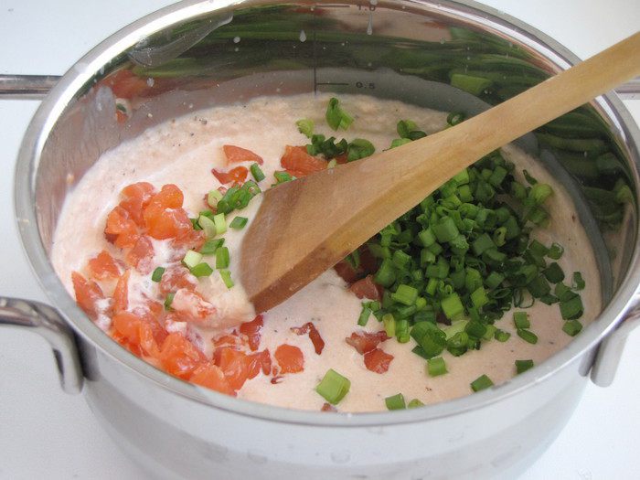 Сливки вместе с лососем смолоть в блендере в однородную массу, перелить обратно в кастрюльку.