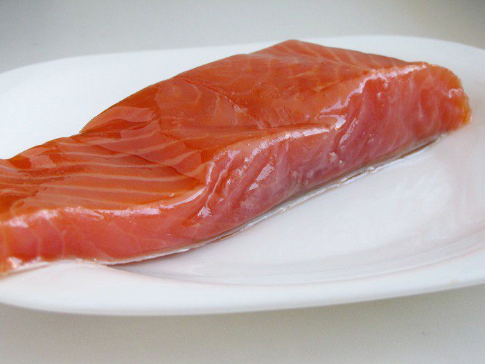 Достать кусочек лосося из упаковки. Я не нашла лосося, поэтому взяла копченую форель.