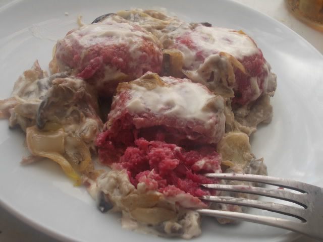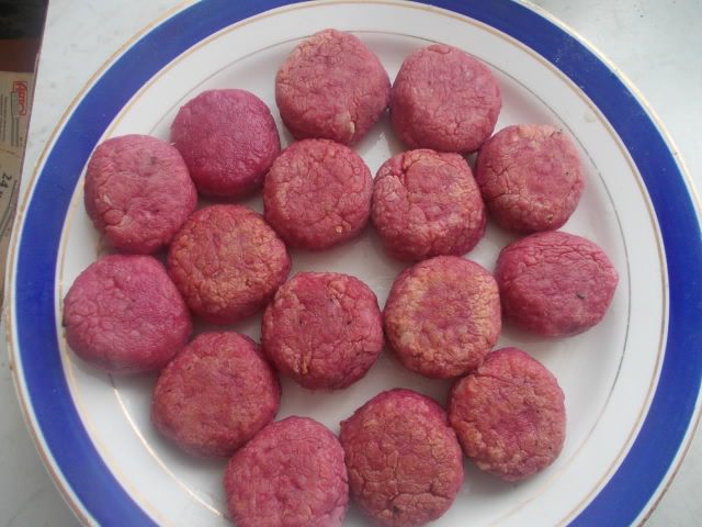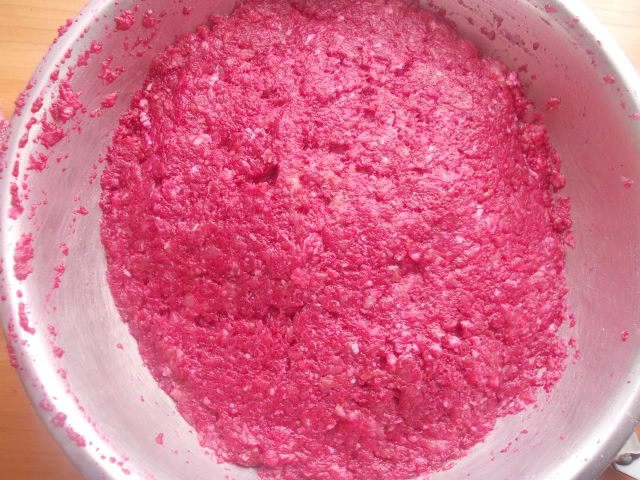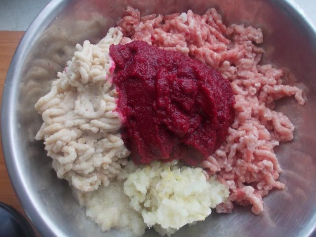 К мясу помолоть лук,чеснок и булочку, посолить и поперчить. Свеклу порезать и взбить хорошо в блендере, вместе с яйцом.