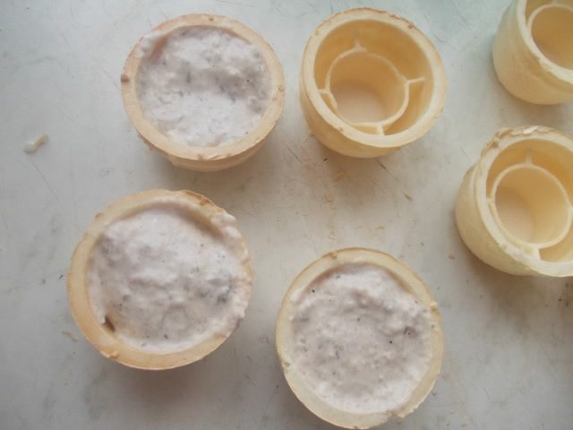 Я брала покупные тарталетки, можно приготовить самой. Наполняем их соусом.