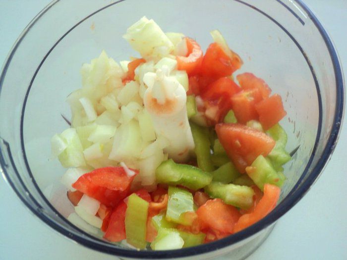 Помидоры залить на 2-3 минуты горячей водой, затем снять кожицу и порезать помидор кусочками. Перец почистить от семян и также порезать кусочками. Добавить лук и измельчить овощи в блендере.