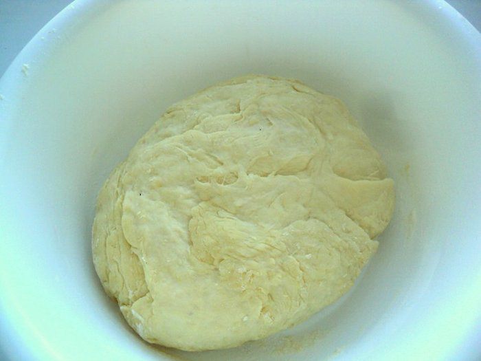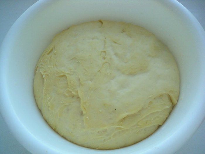 В теплую воду добавить соль, сахар, сухие дрожжи, растительное масло, муку и замесить тесто.