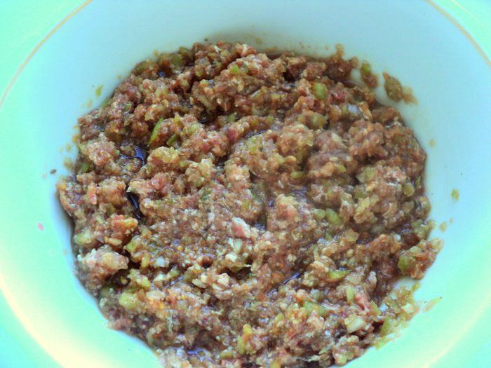 Соединить овощную смесь и говяжий фарш, добавить специи, посолить по вкусу.