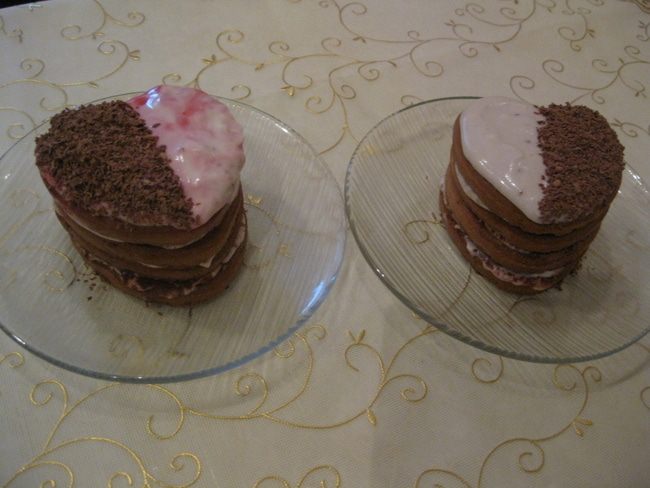 Сверху я украсила тертым на мелкой терке шоколадом, который насыпаем чайной ложкой. И 3-мя ягодами смородины. Красной на розовое женское сердечко и черной на мужское сердце.