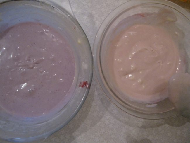 Крем разделим на 2 части. Заранее размораживаем смородину. Оставим пару ягод для украшения. Красную и черную смородину растираем и сок красной добавим в одну часть, сок черной в другую. Получается розовый и сиреневый крем.