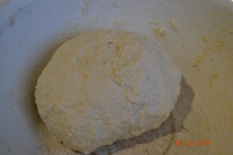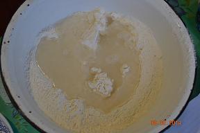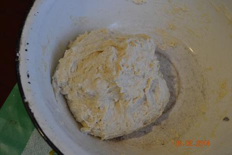 Теперь вмешать размягченный смалец, хорошенько вымесить тесто, накрыть и поставить в теплое место на 1-1,5 часа.