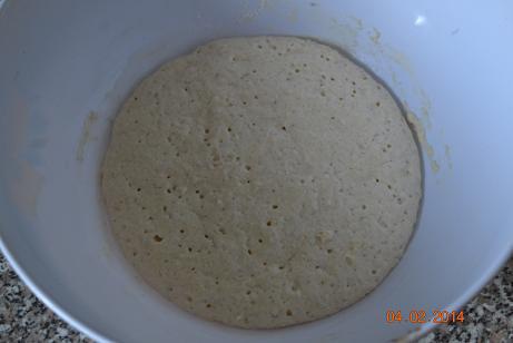 Опара: муку 75 г, манку 75 г, дрожжи 2 г и сахар смешать, влить теплую воду 100 г, и перемешать, оставить на 1,5 часа в тепле. Вот такая она в подошедшем виде...