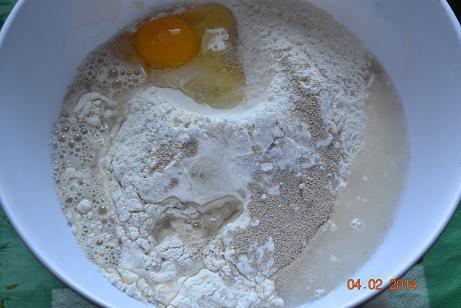 Тесто: в опару всыпать оставшуюся муку, соль, дрожжи 3 г, постепенно влить воду 130 г, вбить яйцо, добавить масло, замесить плотное упругое, но нежное тесто. Накрыть и оставить в тепле на 1-1,5.