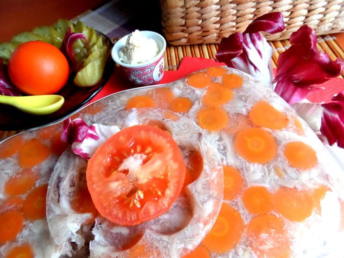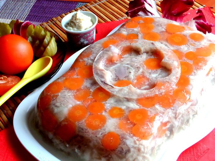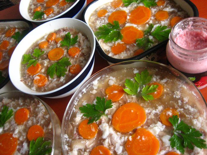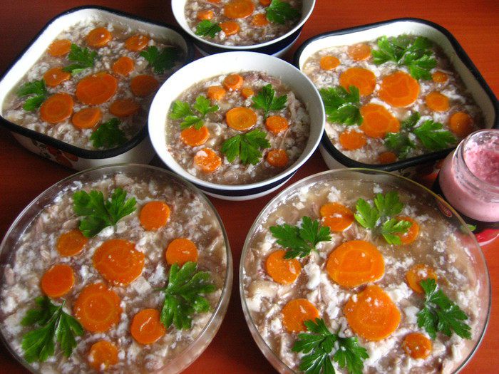Этот холодец делала раньше из этих же ингредиентов, только подавала прямо в пиалках, поэтому морковка и зелень наверху для украшения.